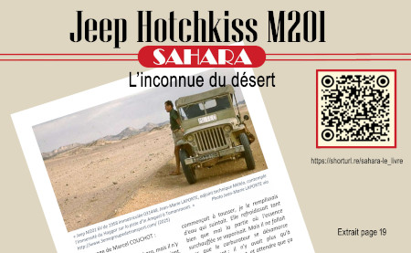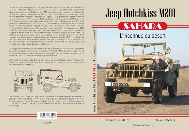 Xavier Peeters et Jean-Louis Martin (JLM201) publient leur premier livre, 190 pages richement illustrées, sur la jeep Hotchkiss M201 Sahara, une des versions de la jeep Hotchkiss M201. La Sahara est spécialement développée pour le conflit algérien en 1959 pour répondre aux besoins spécifiques de l’armée française en zone désertique. Les accords d’Evian de 1962 ne marquent pas la fin de la présence de l’armée française en Algérie… Elle gardera des bases en activité jusqu’en décembre 1967 et même 1970 pour la base ultra-secrète de B2-Namous. La M201 Sahara restera en service en Algérie jusqu’en 1970… Elle connaîtra une 2e vie en Métropole, reconvertie en M201 « ENTAC » ou remise au standard de M201 normale. Aucun exemplaire complet n’ayant survécu, elle est devenue une version un peu mythique. Deux événements vont pourtant la sortir de l’oubli : la découverte en 2002 d’une Sahara relativement complète près de Tarbes et le dynamisme des anciens d’Algérie à travers leurs sites, blogs et nombre de photos d’époque mises en ligne. En 2009 paraît un premier article et une monographie sur le sujet. Combiné avec un intérêt nouveau pour les jeeps aux couleurs de l’armée française d’après 1945, il n’en faut pas plus plus pour faire renaître cette version : dès lors, la restauration ou la reconstitution de M201 Sahara par des collectionneurs passionnés s’accélèrent et s’accompagnent de la refabrication des pièces détachées spécifiques.