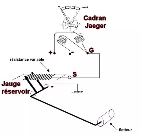 Lorsque le flotteur s’abaisse, la résistance de la jauge augmente et un courant peut circuler dans la bobine de gauche diminuant l’effet de la bobine de droite ce qui attire l’aiguille vers la gauche.