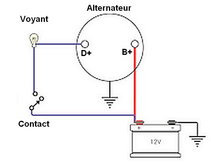 Il me semble bien qu’il faut brancher le D+ à la lampe témoin alimentée après contact, et le B+ sur le +bat. , et c’est tout, l’alternateur à la masse bien sûr.