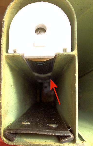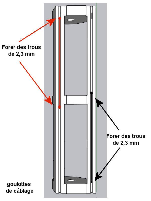 Percer des trous comme indiqué. La matière se perce très facilement à partir du centre de la goulotte par dessous et légèrement incliné vers le contact de batterie.