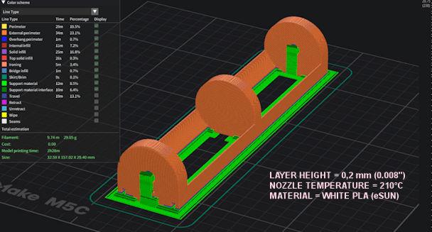 Ca permet de voir s’il y a des erreurs, combien de temps ça prendra et quelle quantité de matière l’objet consommera. Le trancheur réalise aussi automatiquement les nids d’abeilles pour combler les vides intérieurs et consommer moins de matière. (18€ le kg pour une recharge sans bobine)