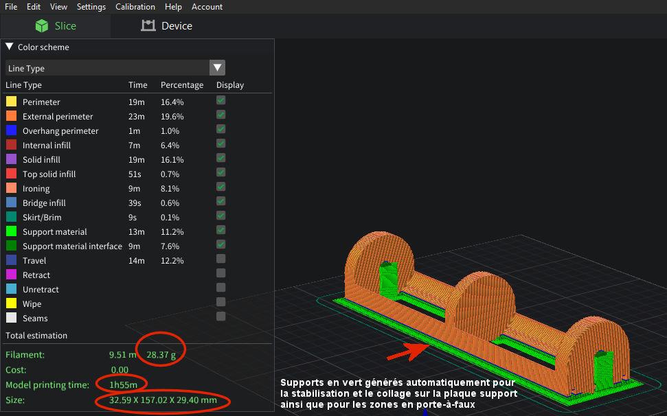 Les couches de 0,2mm au lieu de la valeur par défaut de 0,3 ne sont pas obligatoire, mais j’ai constaté que les supports générés (verts) se détachent plus facilement.