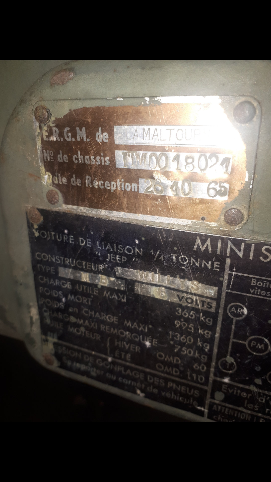 15 février 2020 à 7h21 #154628J’ai relu ton message. Ton châssis est estampillé ITM, il est donc passé en restauration à la Maltournée. A l’époque les châssis, comme d’autres pièces, étaient passés dans un bain de soude pour les décaper, les vérifier et les repeindre. Le plaques Willys étaient généralement détruites par la soude ou très probablement enlevées lors de la frappe ITM qui donne une nouvelle identité au châssis. Donc peu de chance que ta plaque soit d’époque.