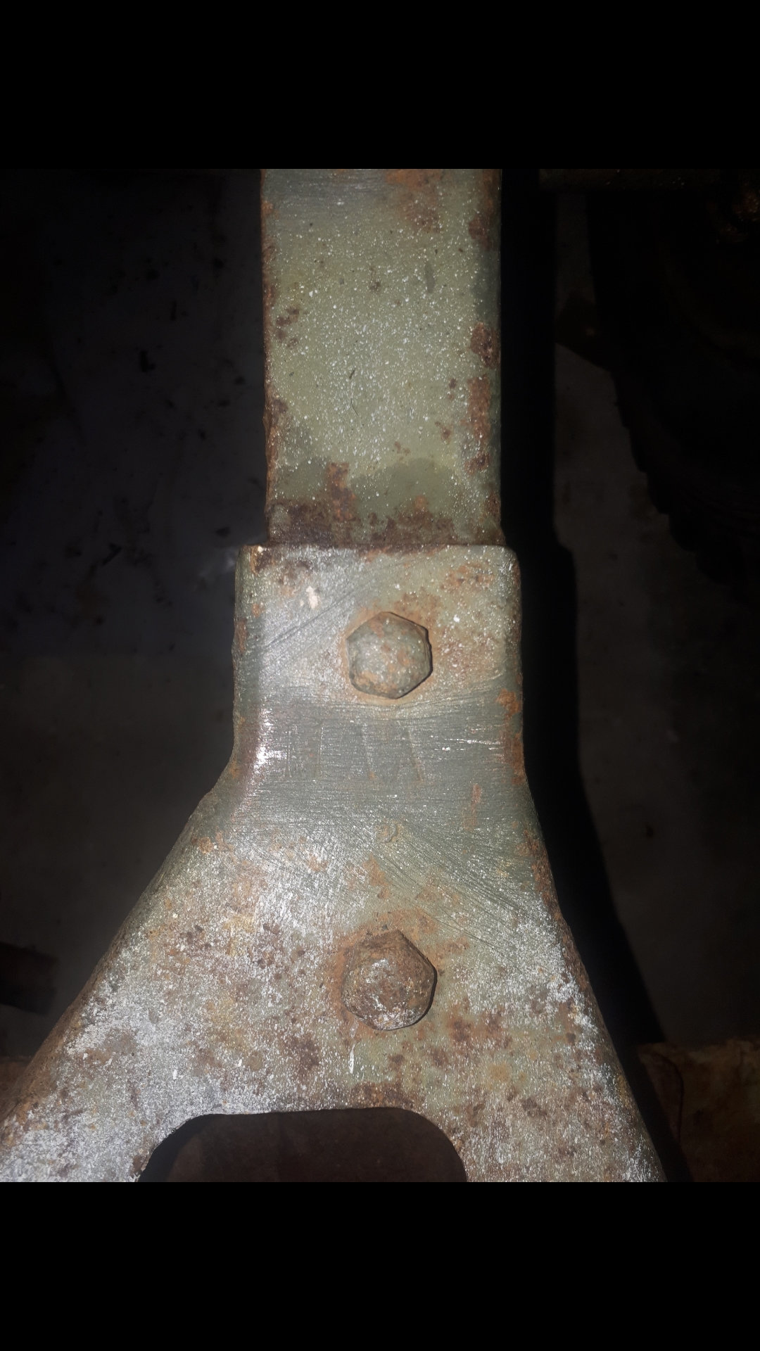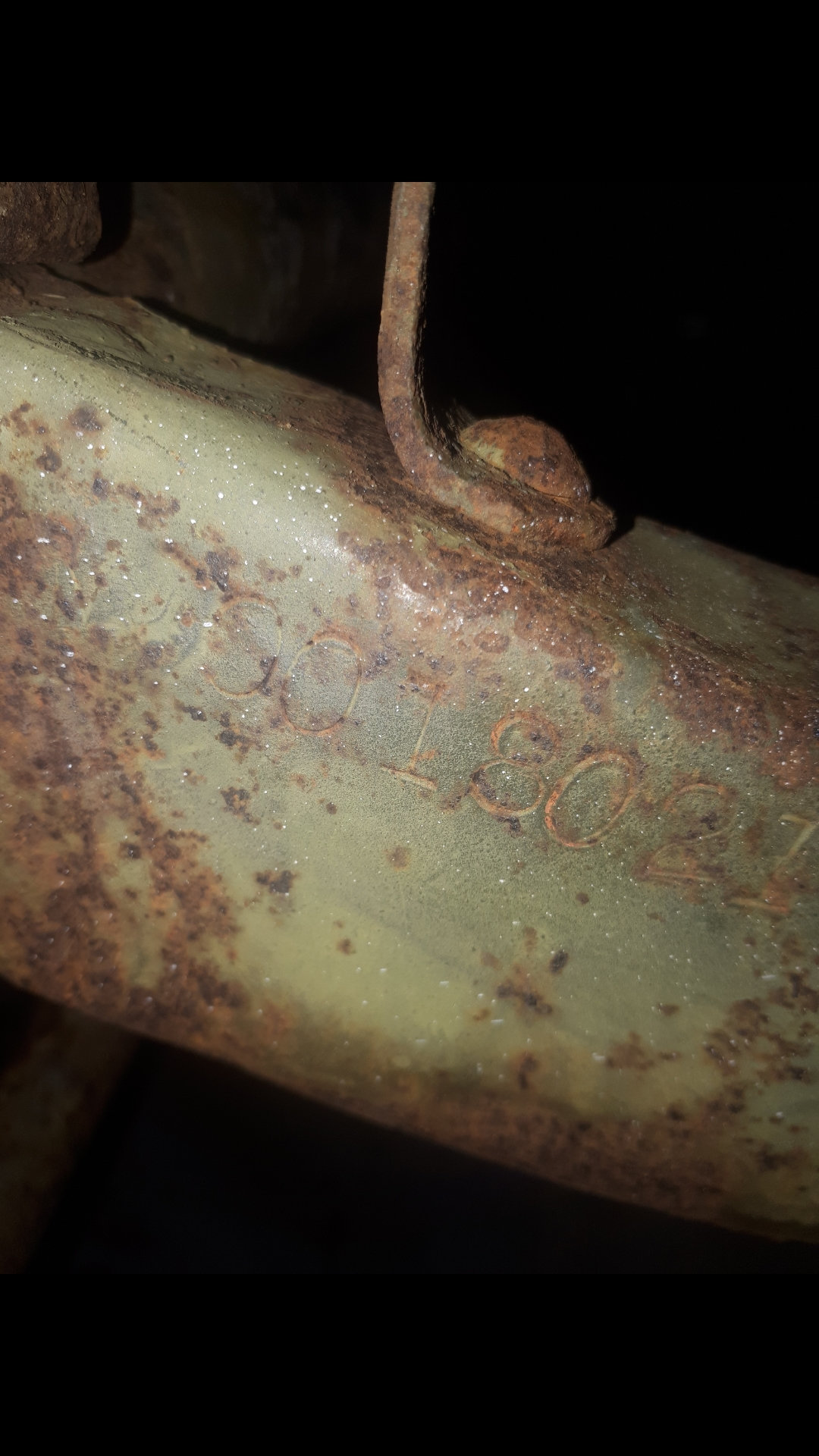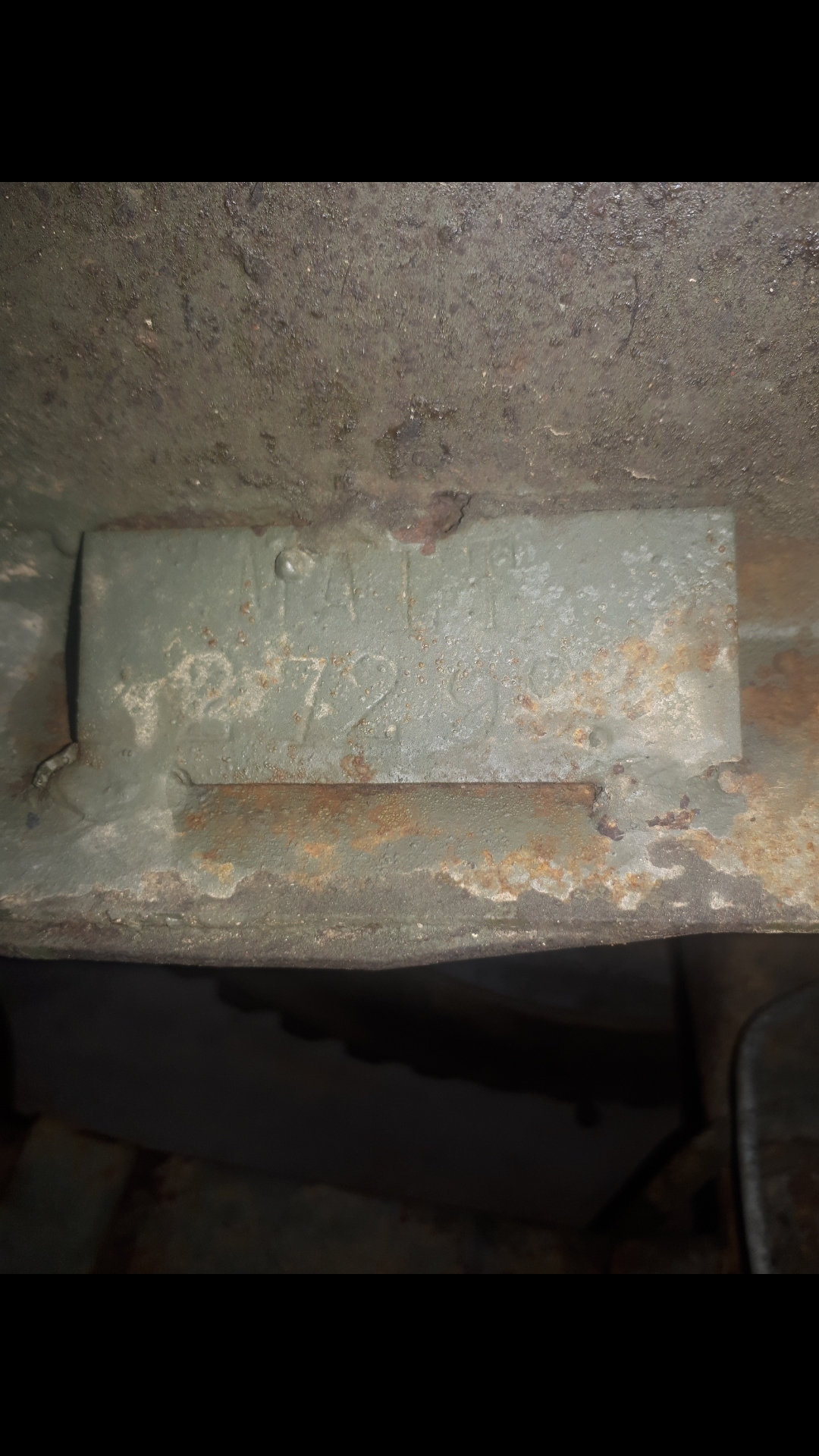 la plaque rivetée sur le longeront gauche à l’avant indique : MB 231068., elle a le gougeon de masse soudé à l’avant en dessous et plusieurs détails du chassis qui m’amènent à penser qu’elle serait de 1943… par contre plusieurs éléments n’ont théoriquement rien à faire ici… capot M201 et pare brise avec emplacement des butées de capot et moteur électrique d’essui glaces. pour le reste c’est bien une caisse willys mais pas de 43 car les renforts triangulaires à l’avant sont de type ACM type 2… j’ai un moteur qui semble récent, il y a HUS 58 de frappé sur le plan de joint de culasse, un filtre à air de HOTCHKISS (je pense).. la boite de transfert est équipée d’un frein à main avec garniture interne, et il y a une plaquette MALT soudée en dessous dans le longeron droit mais je n’arrive pas à lire le chiffre. elle est équipée d’un volant bakelite couleur kaki et d’un compteur en km/h… un taré à perce un trou rectangulaire dans la planche de bord pour y mettre un bouton de feux de détresse et biensur les clignotants moches qui vont avec.. Voilà l’état des lieux, à l’écrire ca fait vraiment merguez!