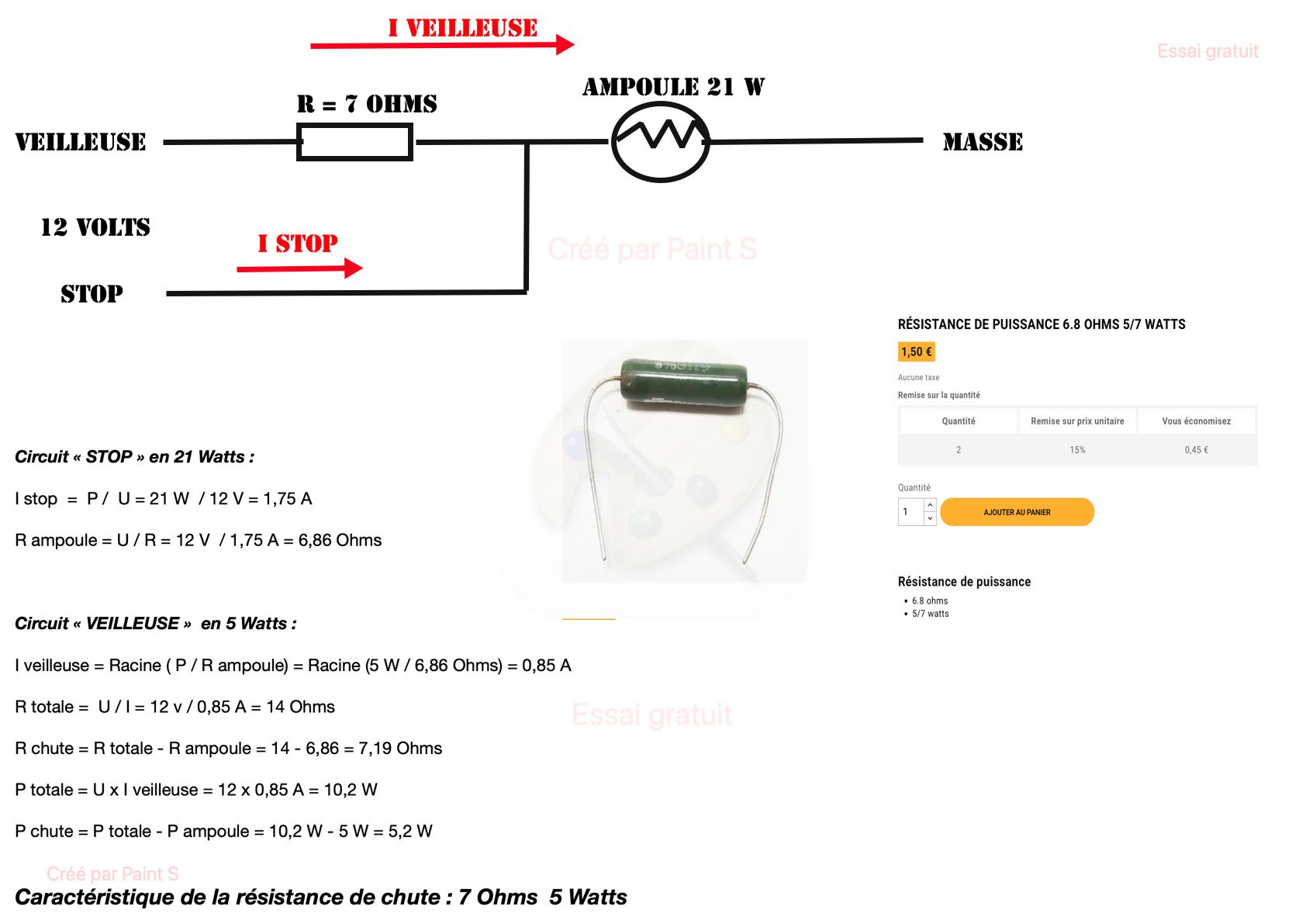 C’est un calcul théorique qui doit servir de base, si l’intensité lumineuse en veilleuse est trop faible il faudra diminuer un peu la valeur de la résistance.