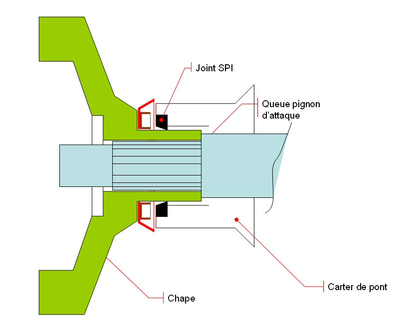 Je pense avoir l’explication. La chape neuve récupérée était destinée à la sortie de boite de transfert et donc munie d’un cache poussière adhoc. Le joint spi sur nez de pont se monte donc seul (avec coté huile un filet de loctite noir pour éviter les fuites) et il n’est pas protégé de la boue du coté extérieur.