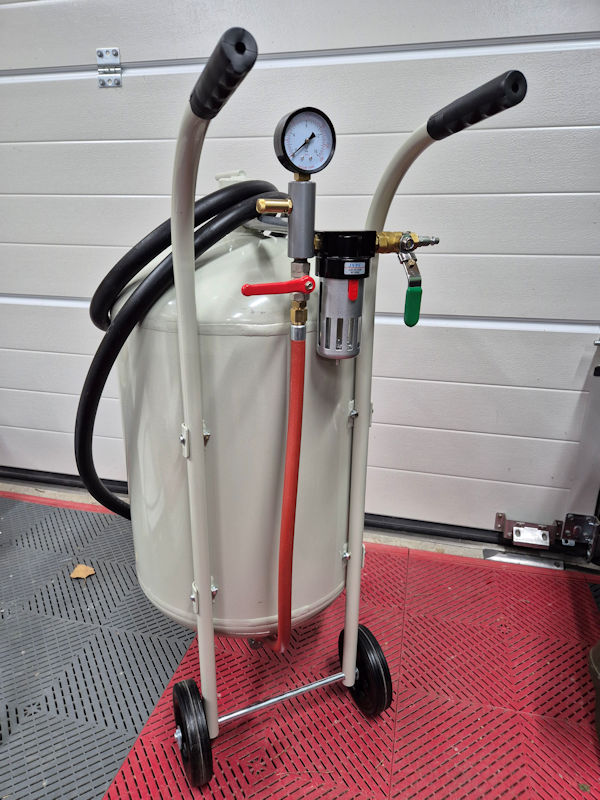 Pour le compresseur, j’ai ce qu’il faut … 3 CV, cuve de 150 litresCette sableuse va me permettre de préparer un ensemble de pièces qui attendent sur leur étagère un sablage et une mise en peinture … J’ai aussi un châssis à sabler.
