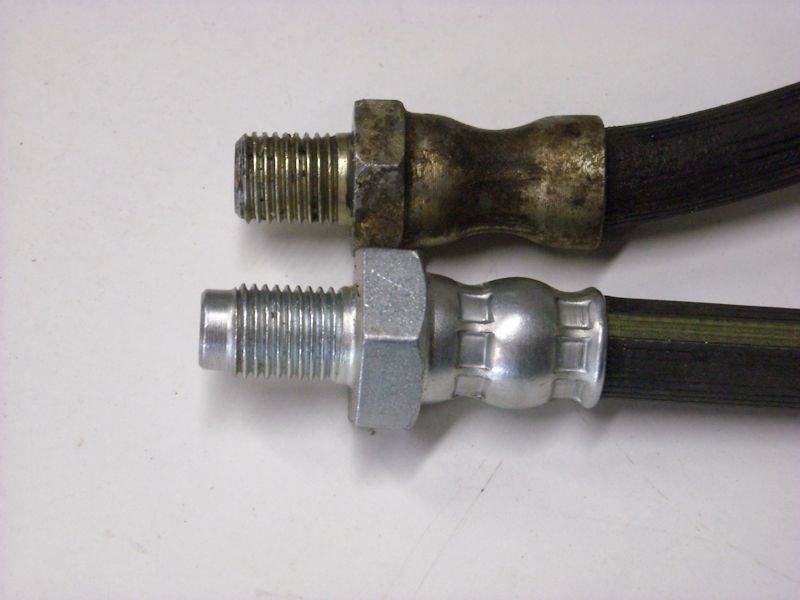 Pas de difficulté majeure si ce n’est quelques adaptations sur les courbures des tubes.Le plus agaçant, le flexible ! Celui-ci vient se visser dans le “T” en laiton qui se trouve sur une platine elle-même fixée sur le carter de pont. Normalement, l’étanchéité se fait avec une rondelle en cuivre mais … L’embout du flexible est trop long ! Sur le flexible d’origine, l’embout fait 13 mm … Sur le nouveau flexible il fait 15 mm !