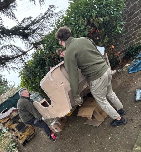Si vous avez suivi les posts sur la carrosserie de la HWL vous savez que nous arrivions au bout du chantier decoupage/soudure. Merci a la donneuse pour tous les organes et petites pieces mais il est temps de passer a l’autre etape importante la réintegration de la caisse et du chassis. je vous passe les etapes préliminaires de peinture d’apret de poncage fin et des couches de couleur a minima sous la caisse. (un voile sera necessaire sur la partie exterieure et interieure de la caisse). A l occasion de festivités voila une main d’oeuvre bienvenue pour soulever et mettre tout en place (vive les grandes familles faites de costaud gaillards….enfin une utilité à la fréquentation des salles de musculation !!!)