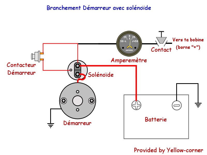 On pourrait préciser en outre que généralement, l’alimentation électrique (contact, tableau de bord, éclairage …) est prise sur la borne du lanceur du démarreur connectée à la batterie ce qui explique qu’il y ait 2 fils connectés (un gros vers la batterie et un petit vers l’alimentation électrique).
