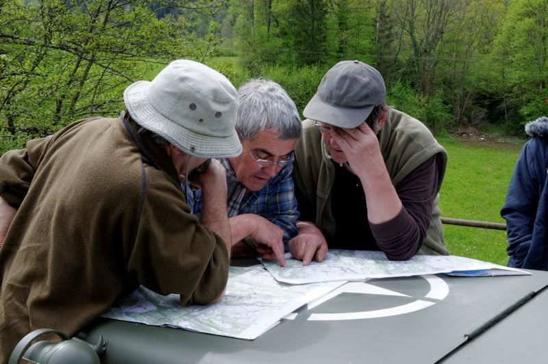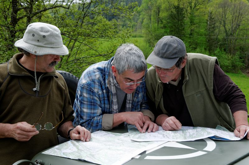 Christian, René et Michel faisant semblant de lire une carte d’état Major !