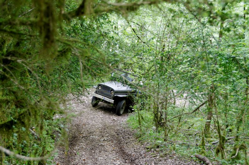 En haut du raccourci, impossible de passer, la roue avant droite décolle du chemin et la Jeep ne passe pas.