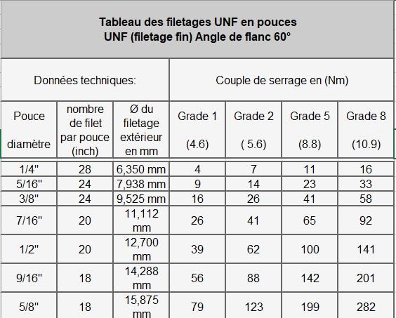 28 octobre 2025 à 6h29 #173896Si on consulte des tableaux de couple de serrage pour UNF la valeur de 6kg m (61N m) correspond à la classe maxi la classe 8 équivalent au 12.9 de chez nous, pour de l’acier classe 5 ça descend 4,2 kg m ( 41N m)