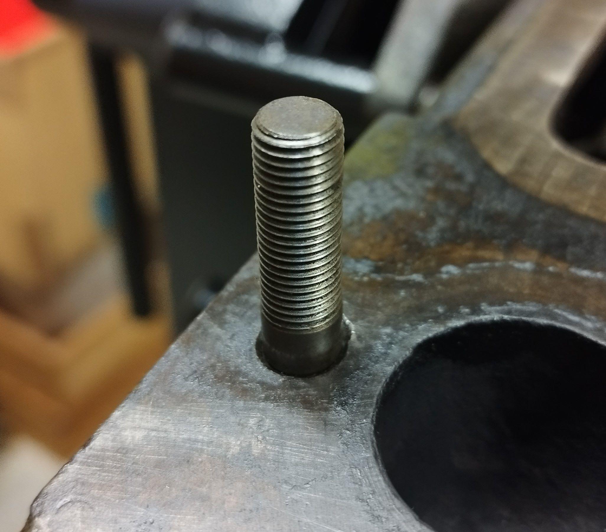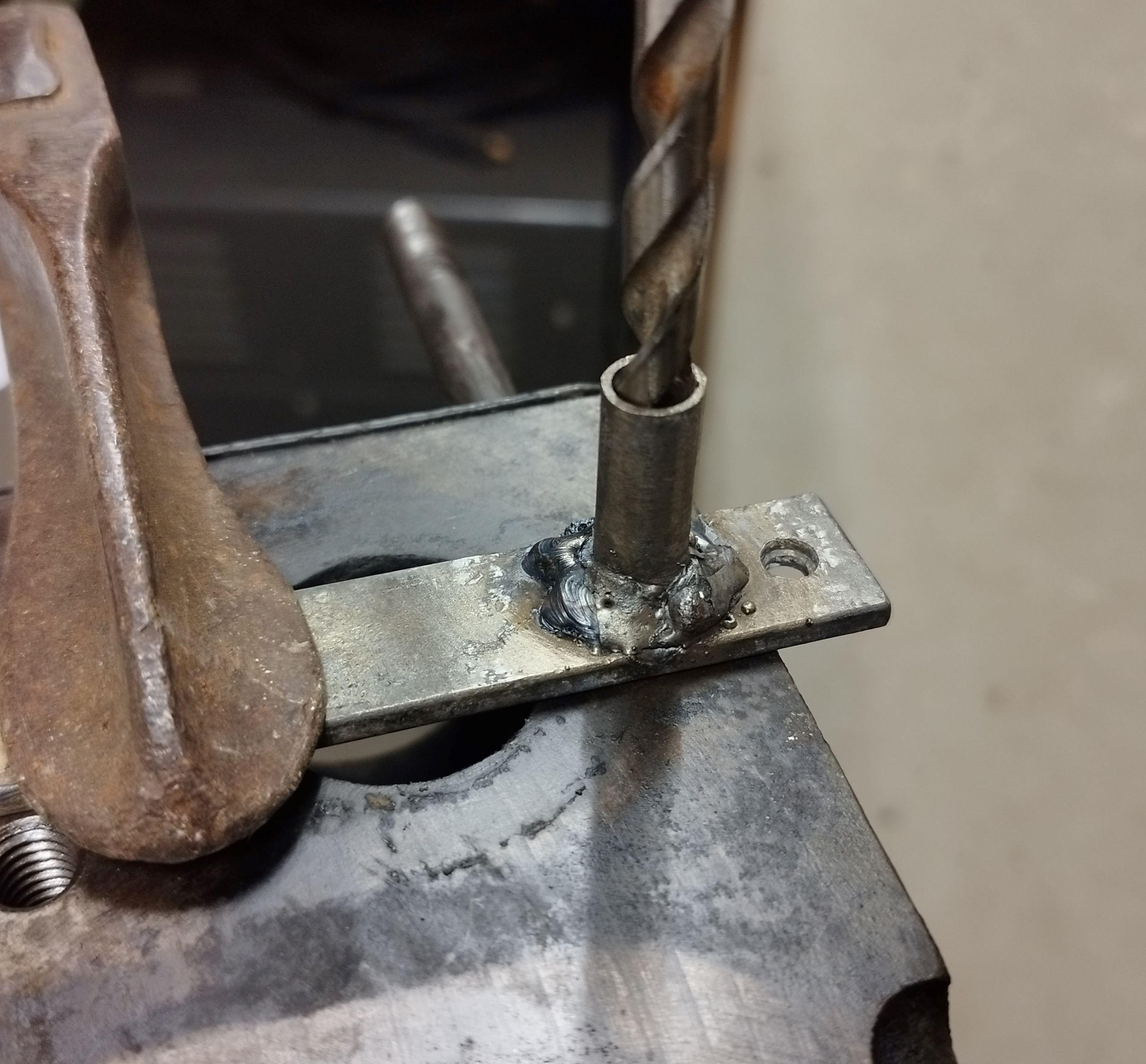 j’ai suivi votre conseil et j’ai procédé au perçage du goujon cassé. Je n’ai pas de perceuse magnétique, mais une à colonne. j’ai abandonné cette dernière technique car le bloc moteur est trop lourd et impossible de le manipuler facilement. Du coup, j’ai fabriqué (un peu salement) un guide foret avec un fer plat et soudé un tube de 7mm intérieur que j’ai alésé à 7,7mm et ainsi être parfaitement perpendiculaire. Je l’ai fixé avec un serre joint.