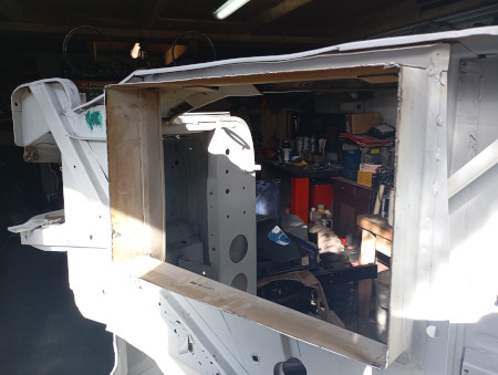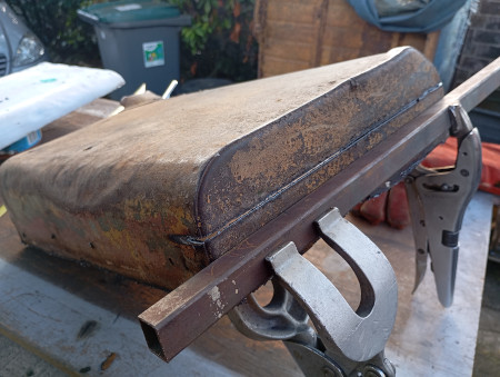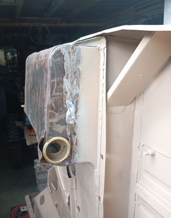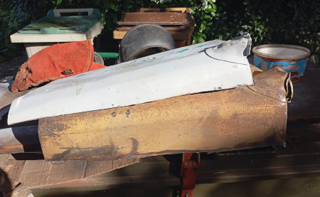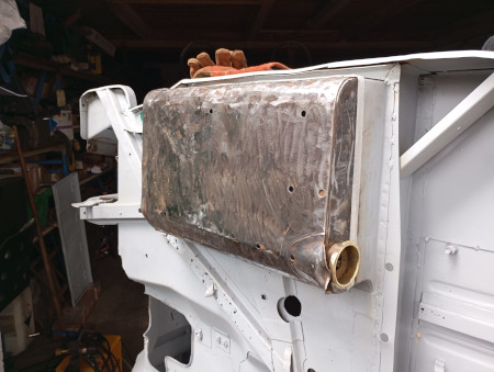 c est toujours la meme chose on voit au début les gros trous que l’on comblent puis on s’attaque aux plus petits et a la fin on se dit que tout ce travail fait pour laisser la tole de protection du reservoir en dentelles…ben non peut pas laisser en l etat. Alors oui vous me direz “allez changes tout mon loulou..”sauf que j’en ai ras la casquette de tout depointer deux fois (la donneuse et le patient) et donc j’opte pour du direct….on decoupe à l horizontal le malade , de meme sur la donneuse en prenant une bonne marge puis on ajuste pour que ca matche bien…